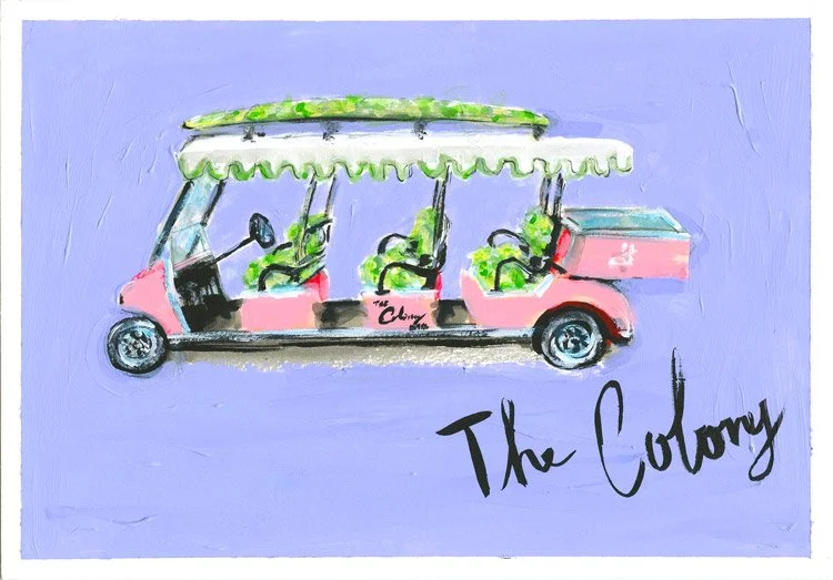 The Colony Cart decorated in paradise pink with interior seats upholstered in banana leaf print, hand-painted by Leigh just outside the boutique hotel, 2022.